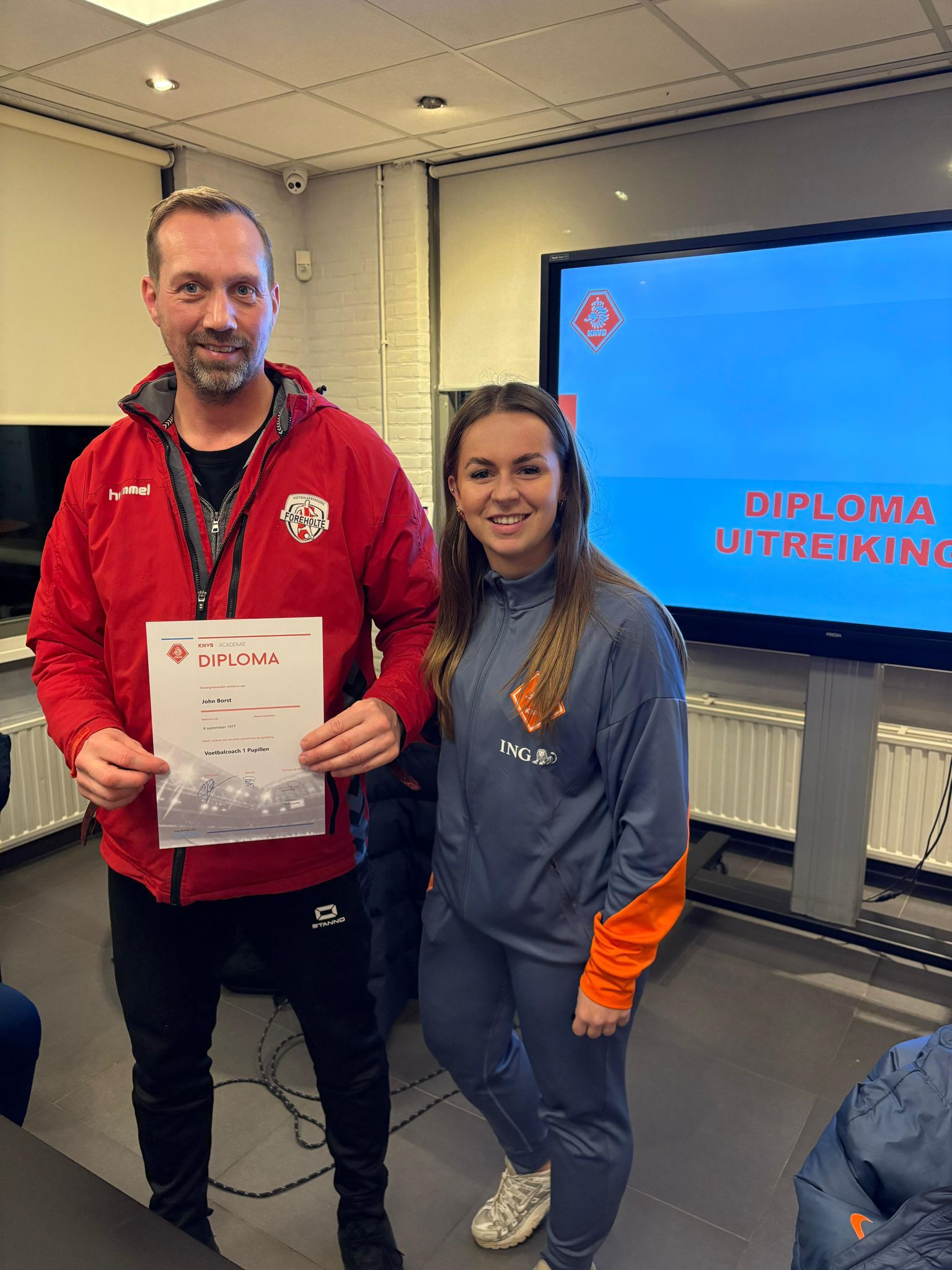De diploma’s werden maandagavond uitgereikt door KNVB-docent Kevin Compier, die zelf een rijk Foreholte-verleden heeft. Ook John Borst mocht zijn diploma in ontvangst nemen, uit handen van oud-Foreholte-trainster en KNVB-docent Shannon Ausma.